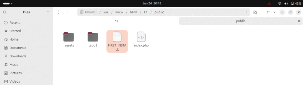TYPO3 is asking to create a file with name “FIRST_INSTALL” in root directory (inside <your_installation_directory>/pub).