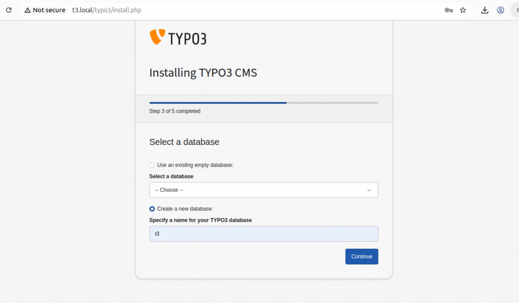 TYPO3 will allow you to choose existing created database or it will ask you to enter new database name.